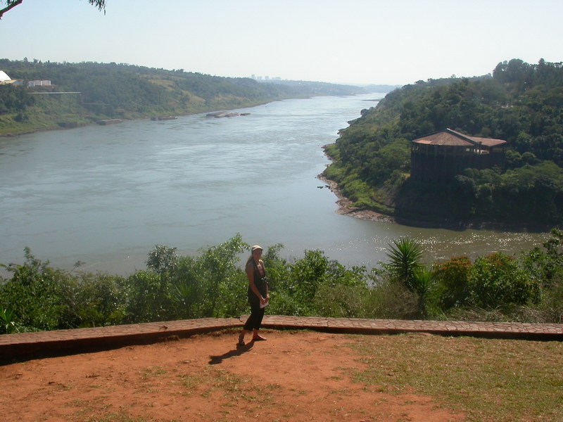 Véro aux Tres Fronteras, les « trois frontières » : sous ses pieds l’Argentine, dans le fond à droite le Brésil, et à gauche le Paraguay… Le plus grand des deux fleuves, c’est le Parana, et la rivière qui vient de la droite la fameuse Iguazu, dont les chutes se trouvent 25 kilomètres en amont.