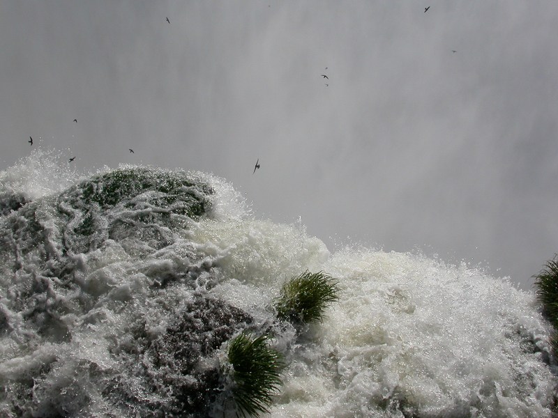 Des Martinets à tête grise (Cypseloides senex) montrent leurs qualités de voltigeurs infatigables dans la vapeur d’eau permanente de la Gargantua del Diablo (gorge du Diable), la cascade la plus impressionnante d’Iguazu. Avec 70 mètres de hauteur, cet ensemble de chutes en forme de fer à cheval provoque une remontée de vapeur qui masque toujours le bas, rendant la scène encore plus forte. Les martinets sont les seuls animaux à vivre en cet endroit si inhospitalier, ils font même leur nid derrière certaines chutes !