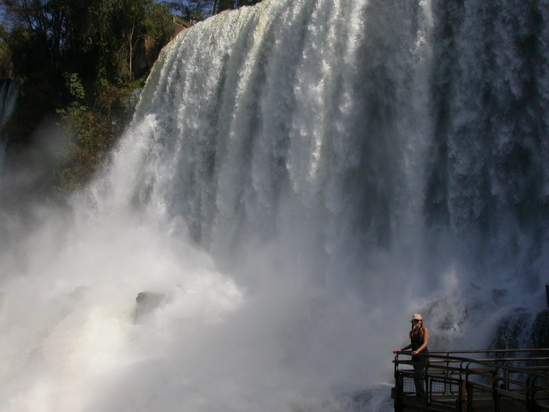 Vue des chutes depuis la passerelle du niveau supérieur. Quelle merveille ! Le tout dans un écrin de verdure, avec l’espoir de voir un toucan, mais aussi plein d’autres joyaux ailés : callistes, tangaras, geais… Je ne connais pas une plus belle toile de fond pour pratiquer l’ornithologie en forêt tropicale… Chaque chute ou presque (du moins les plus grandes) ont un nom : Bossetti, les Trois mousquetaires, les deux soeurs… Le système de passerelle, remarquablement agencé, permet aux visiteurs de voir les chutes sous tous les angles et d’avoir un contact charnel avec certaines chutes, contact… humide parfois, comme pour Bossetti.