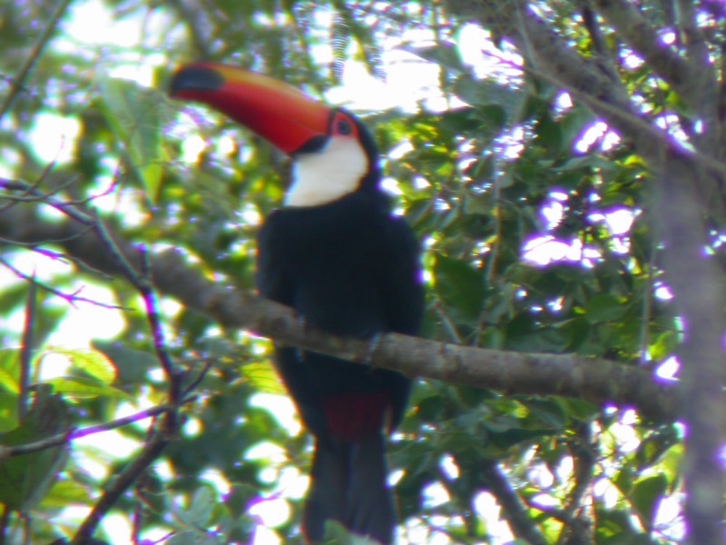 Le voici ! Un des oiseaux les plus emblématiques du continent sud-américain, le Toucan toco (Ramphastos toco). La photo est floue mais l’oiseau bien posé dans sa branche restera toujours dans nos esprits. Les toucans sont des oiseaux qui vivent dans les forêts tropicales d’Amérique. On en compte 37 espèces différentes, qui se caractérisent par un très gros bec, long et recourbé, ainsi que par des teintes vives. Le Toucan toco, avec ses 60 centimètres, est le plus gros de tous. Et enfin nous l’avons vu…