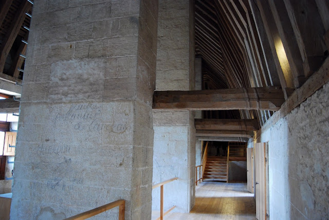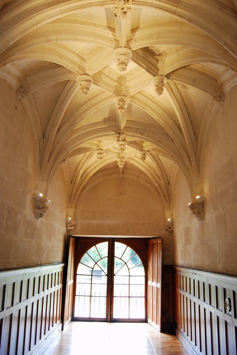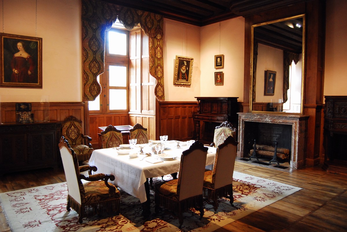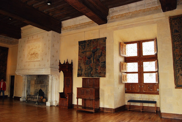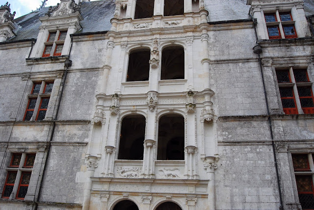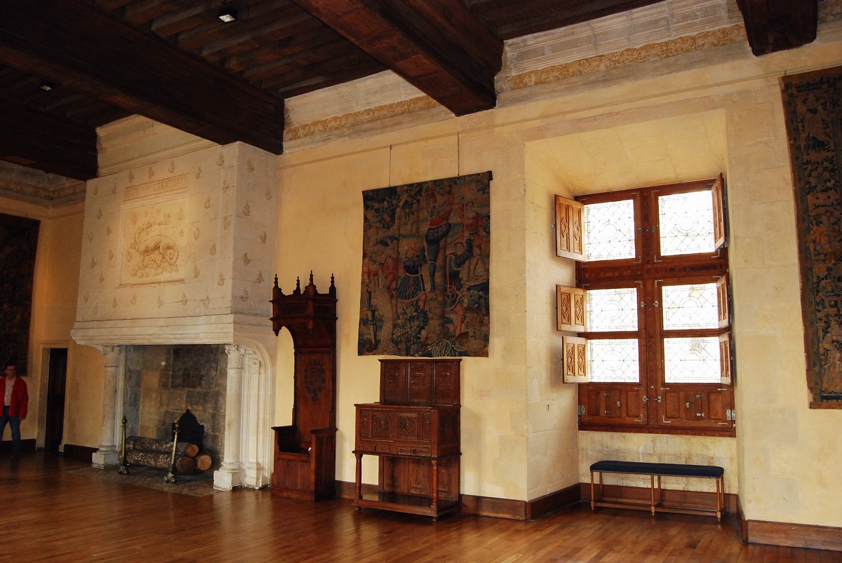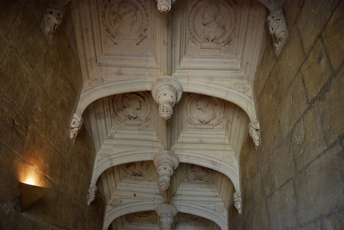 On pénètre donc dans le château par la monumentale entrée frappée de la salamandre et de l’hermine, emblèmes de François Ier et de sa femme la reine Claude. L’escalier d’honneur aux multiples volées de marches est un bijou. Le plafond à caissons est décoré de médaillons sculptés représentant des bustes vus de profil de grands personnages.