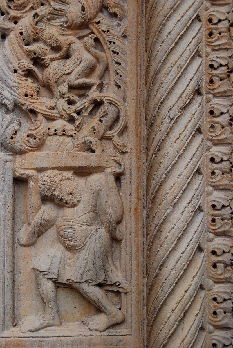 détail du côté gauche du portail principal avec les scènes bibliques relatives à Adam et Eve : création d’Adam,