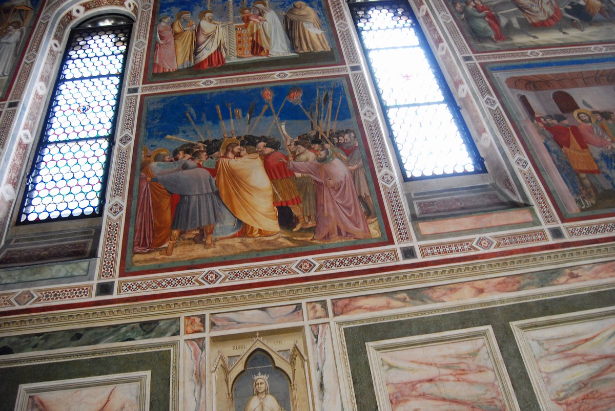 se passant de tout décor architectural, Giotto s’est une fois de plus intéressé aux Humains. Avec force, Judas se presse contre le Christ, l’enveloppant presque totalement sous sa cape. Leurs visages sont en collision, rapprochés encore davantage par la foule qui les attire, les pousse. Le conflit est inévitable, la scène tragique. Un visage grave, l’autre malicieux.