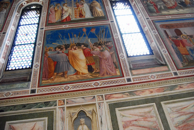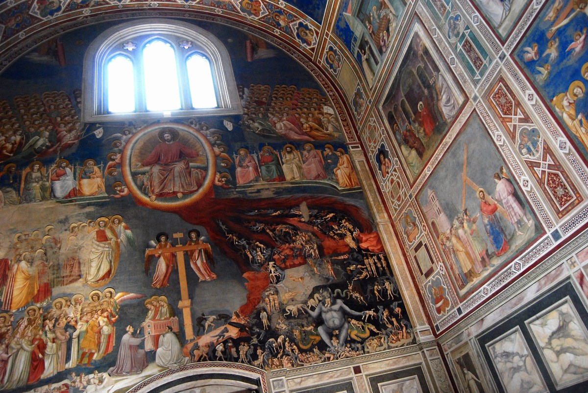 C’est en 1300 qu’Enrico Scrovegni fit appel au plus grand génie de son époque pour procéder à la décoration de sa chapelle : Giotto. C’est son grand coup de maître avec le cycle de la basilique haute de la basilique Saint-François, à Assise. Il accomplit ici une double série tirée de l’Ancien et du Nouveau Testament, le tout suivant un ordre chronologique, de la vie d’Anne et de Joachim, les parents de Marie, à celle du Christ. En quatre ans, de 1303 à 1306, Giotto achève les 53 fresques, signant là probablement le plus grand chef-d’oeuvre artistique de tous les temps. On raconte que le grand écrivain Dante se trouvait à Padoue en même temps que le peintre réalisait ses fresques. Giotto aurait été inspiré par plusieurs scènes de la Divine comédie, notamment l’évocation de l’Enfer, dans lequel Dante avait précipité plusieurs de ses contemporains, les jugeant indignes du Salut. Et, parmi ces personnages se trouvait un riche homme du nom de… Reginaldo Scrovegni ! Le père d’Enrico, qui, pour réhabiliter la mémoire et l’honneur de son paternel, fit ériger la chapelle consacrée à la Vierge. C’est dont à une réaction d’orgueil d’un riche commerçant, piqué par une remarque de Dante, que l’on doit ce monumental trésor !