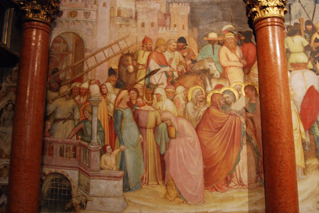 Contrairement à Assise, où les personnages étaient plus grands, ici, et ceci étant dû à l’espace plus restreint dont il disposait, chaque