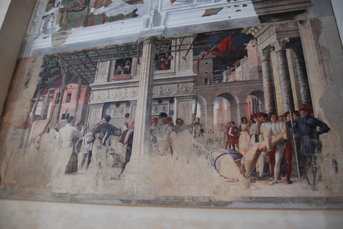 est célèbre pour ses fresques d’Andrea Mantegna, de 1448, qui furent malheureusement détruites lors des bombardements
