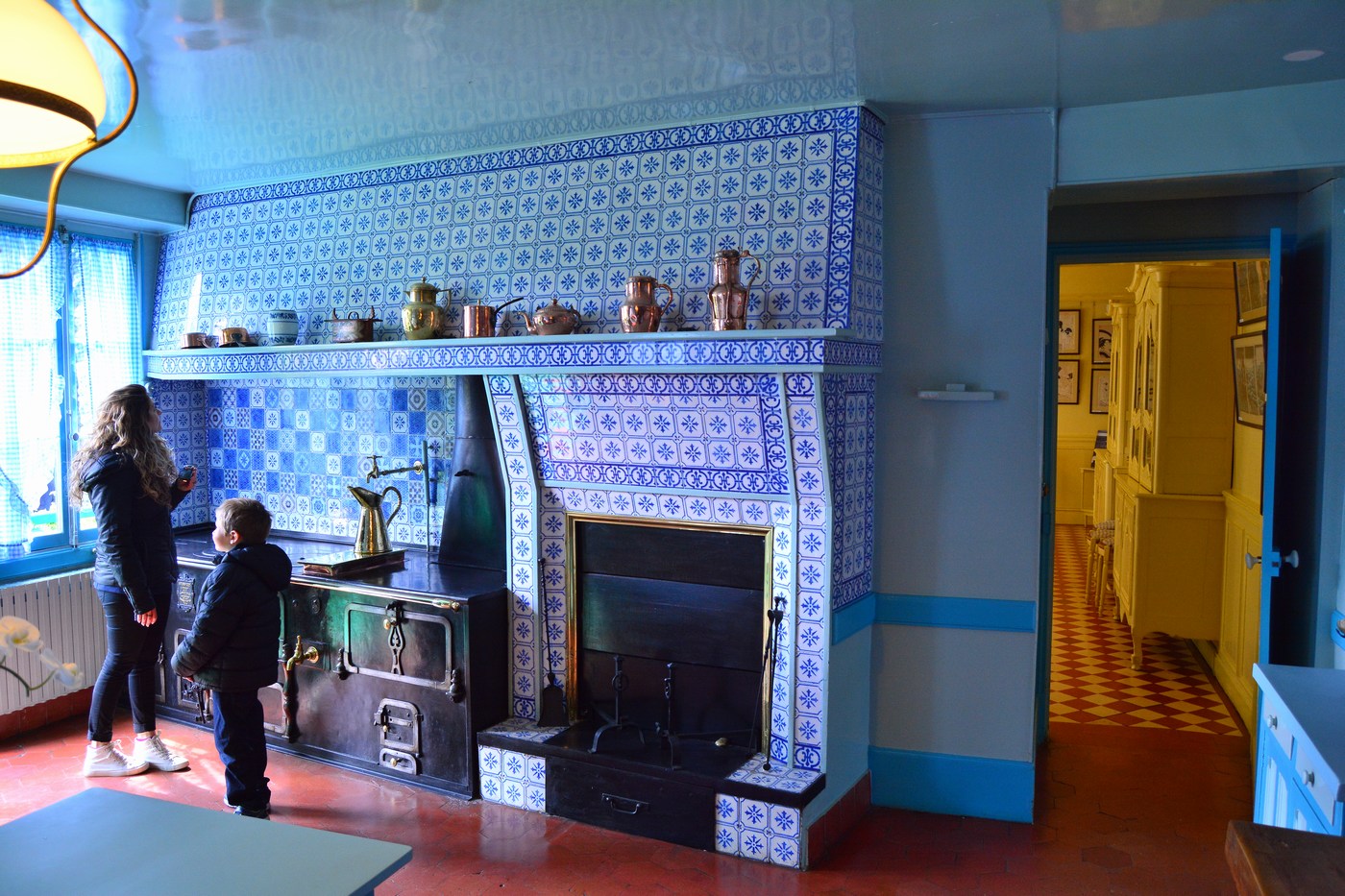 Enfin, la cuisine, bleue, encore une couleur voulue par Monet pour trancher avec le jaune, dont les murs sont entièrement recouverts de carreaux de céramique de Rouen. L'énorme fourneau est surmonté d'ustensiles en cuivre.