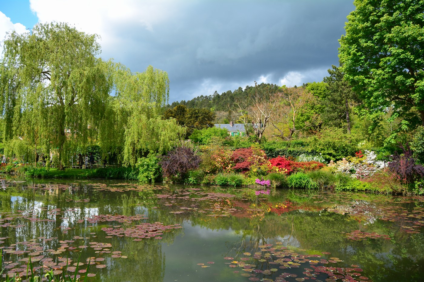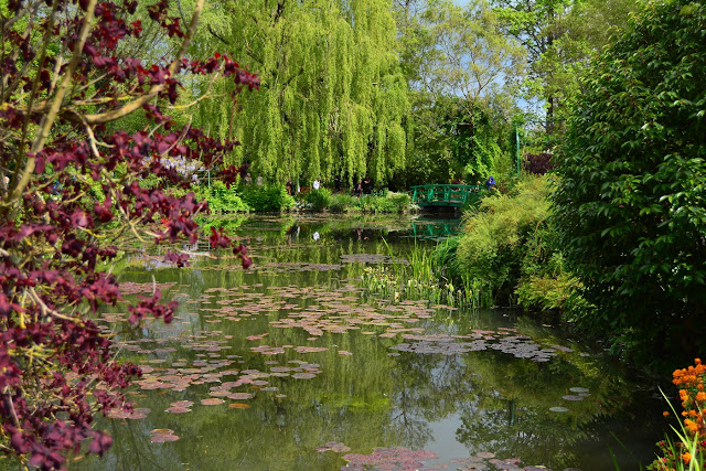 Le toit que l'on aperçoit, noyé dans la végétation, est celui de la maison de Monet, au-delà de la voie de chemin de fer. Un petit tunnel permettait d'accéder au plan d'eau. Durant notre visite de deux heures, nous sommes passés par toutes les couleurs de ciel, et on se dit que le peintre devait trouver là une joie immense en tentant de saisir sur ses toiles les caprices météorologiques !