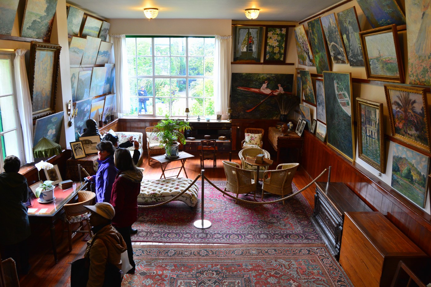 Voici l'atelier du peintre, devenu par la suite un salon-fumoir. Les reproductions au mur évoquent l'état de la pièce du vivant de l'artiste, lui qui aimait conserver une toile de chaque grande étape de son aventure artistique. Tous les objets choisis par Monet sont restés en place depuis sa mort.