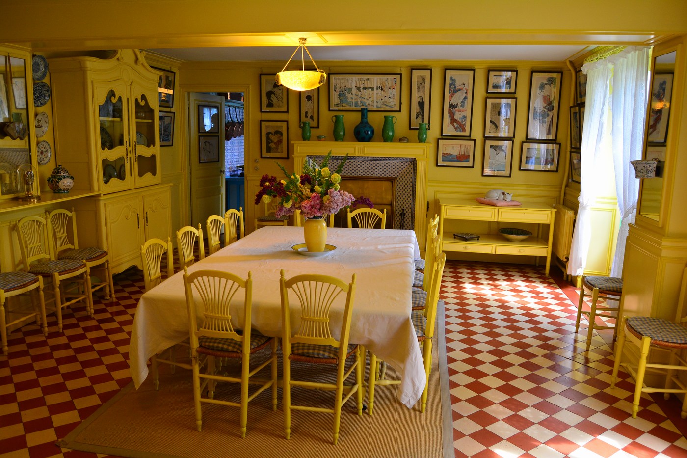 La salle à manger, la plus grande de la maison, la plus colorée aussi, avec ces deux tons de jaune, ce qui ne se faisait pas à l'époque, où l'on préférait rester dans des coloris sombres. Ce jaune fait ressortir le bleu de la faïence. Pour cette pièce, Monet avait choisi de la colorer avec des oeuvres japonaises, lui qui les a collectionnées durant plus de cinquante ans.