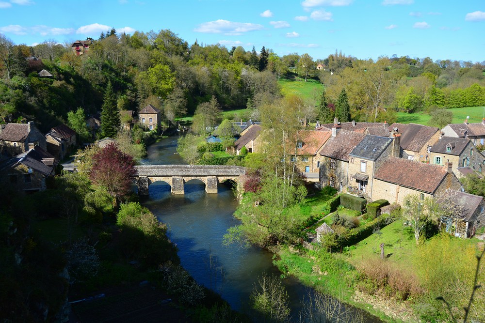 Une vue du village, avec la rivière Sarthe et le pont de pierre.