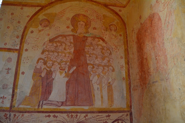La Vierge au manteau est une représentation assez rare de l'iconographie catholique. Elle tire son origine du songe que fit au XIIIème siècle un moine cistercien, qui, admirant le ciel de gloire, voit tous les représentants (anges, martyrs, prophètes...), mais pas ceux de son ordre. La Vierge lui sourit en écartant son manteau, lui assurant que les moines de Cîteaux, bien au contraire, lui sont si importants qu'elle les garde toujours auprès d'elle. D'autres ordres monastiques, comme les Dominicains, tentèrent par la suite de s'approprier cette légende de la Vierge de Miséricorde au manteau.