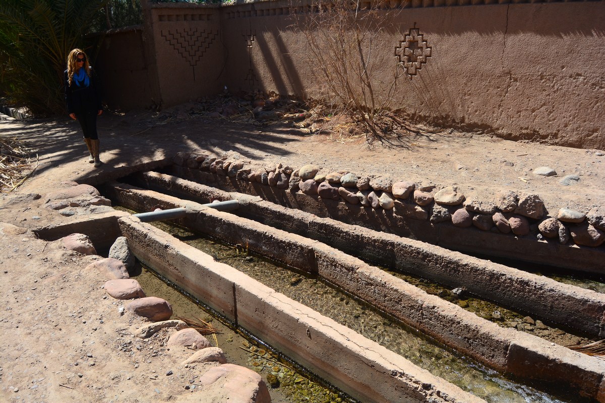 Dans la palmeraie sont disséminées d'autres merveilles. Des koubba par exemples, qui sont des tombeaux de Saints musulmans, avec leur coupole blanche, d'autres kasbahs, et aussi l'ingénieux système d'irrigation : les canaux appelés séguias. Dans une région où l'eau est un don on ne peut plus précieux, chaque goutte compte et doit être équitablement répartie entre les diverses familles qui occupent la palmeraie. Notre guide nous a emmenés au nord, là où la source sort et l'eau répartie. Divers canaux à ciel ouvert (provoquant malheureusement une importante évaporation) partent en tous sens. Un système de trappes permet d'en fermer certaines afin de faire tourner, en fonction des besoins.