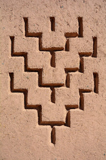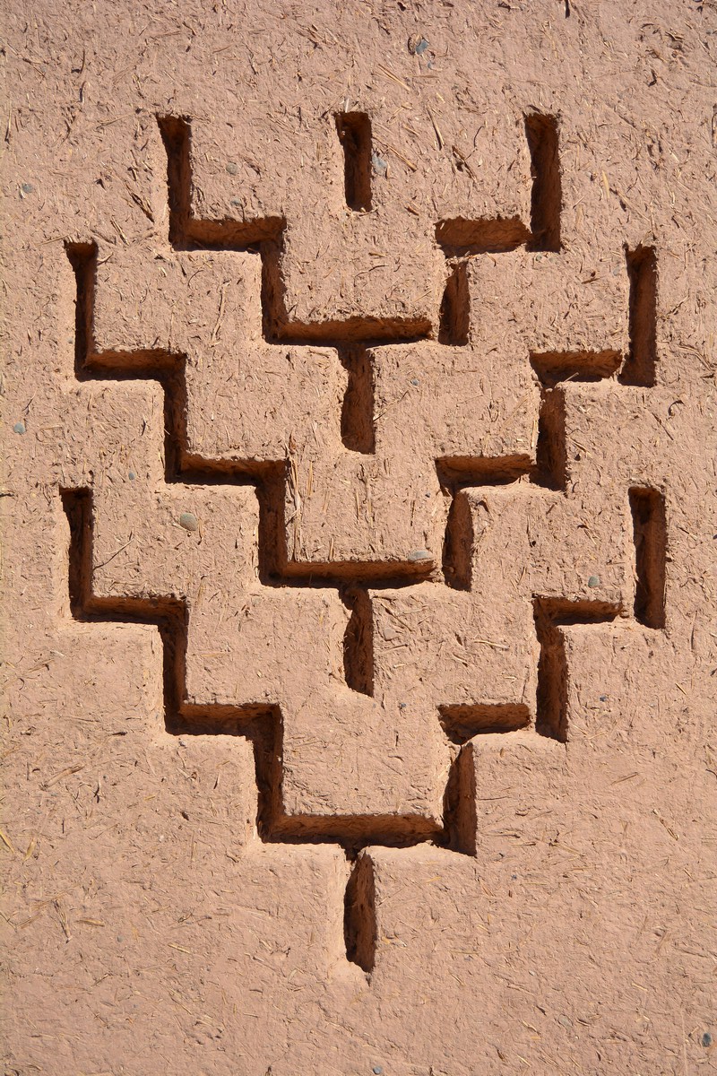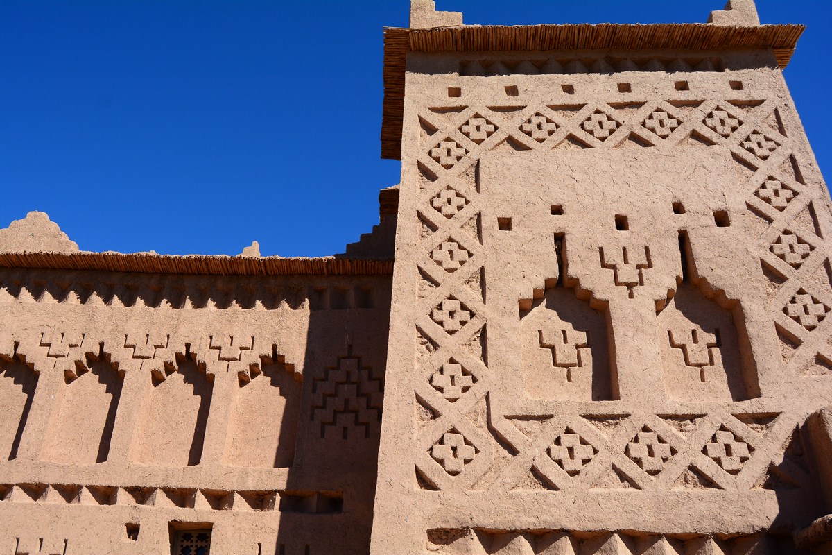De temps en temps, en regardant bien les détails sur les façades, vous remarquerez de fins motifs géométriques : ce sont des symboles berbères, qui font partie intégrante de la culture locale. Souvent, c'est la Nature qui est la plus représentée, ce qui n'est pas une surprise lorsque l'on connaît sa place dans une société longtemps nomade qui s'est sédentarisée progressivement en construisant, notamment, ces édifices en pisé afin d'améliorer leur confort. Ces symboles varient parfois de tribu en tribu. Le plus célèbre est sans aucun doute celui de gauche, l'Homme-libre. Il s'agit en fait d'une lettre, le yaz, dans l'alphabet berbère amazigh.