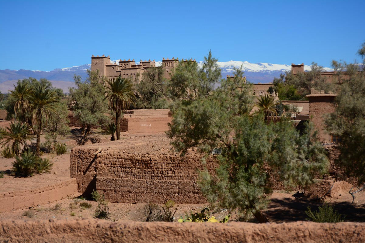 Une autre kasbah dans la palmeraie, sur fond de montagnes de l'Atlas enneigées.