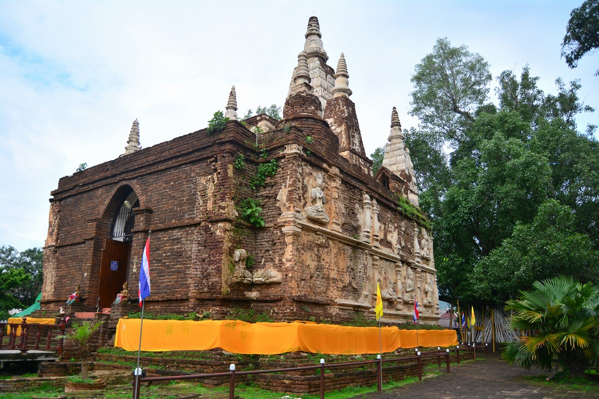 | Le Chedi principal possède sept flèches qui rappellent les sept semaines de méditation du premier bouddha à Bodhgaya dans le nord de l'Inde. Les murs extérieurs sont encore bien conservés. |