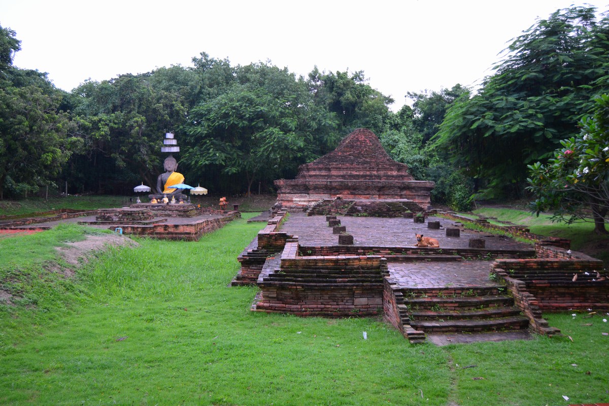 | Vue d'ensemble avec en arrière-plan l'ancien chedi qui devait être blanc à l'origine. |