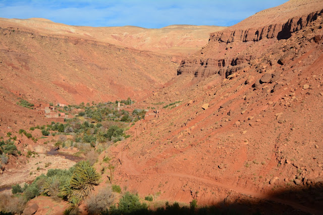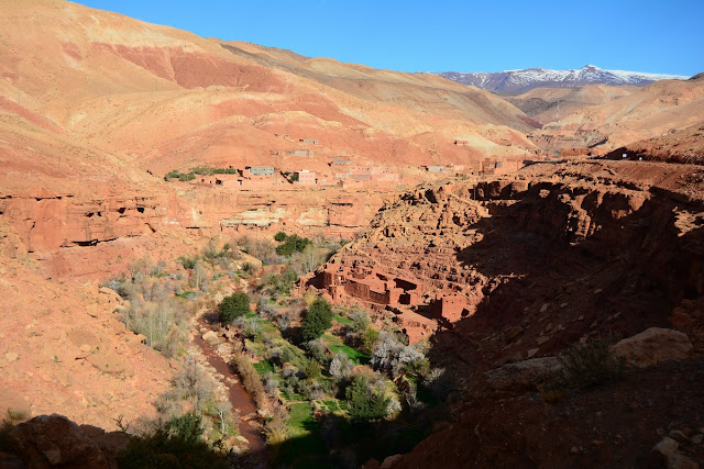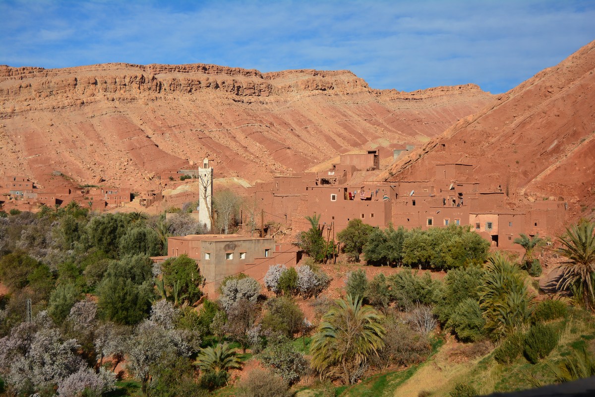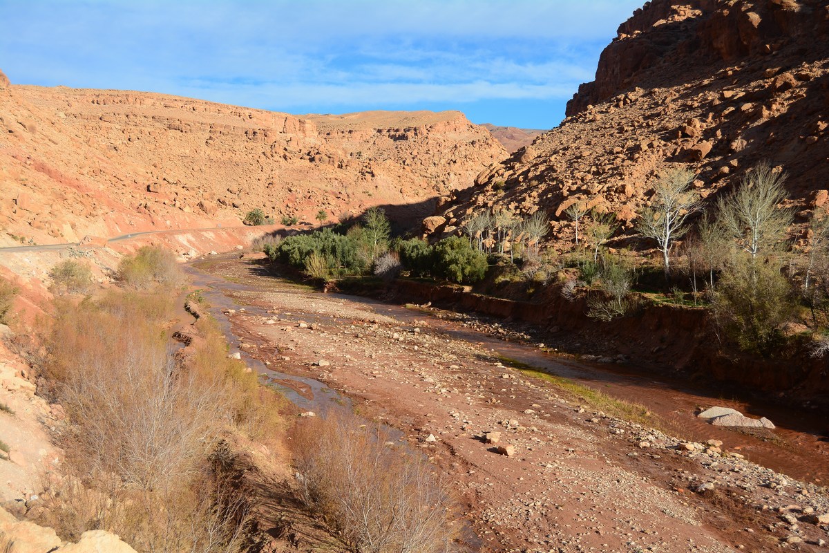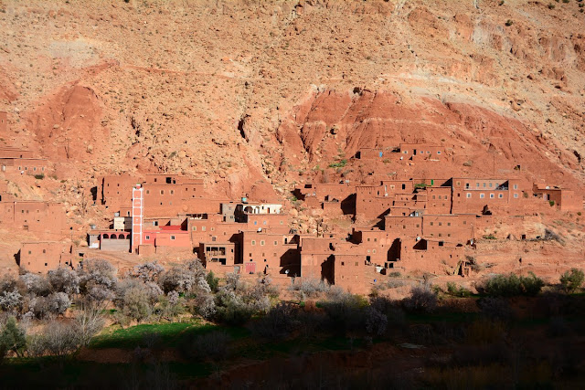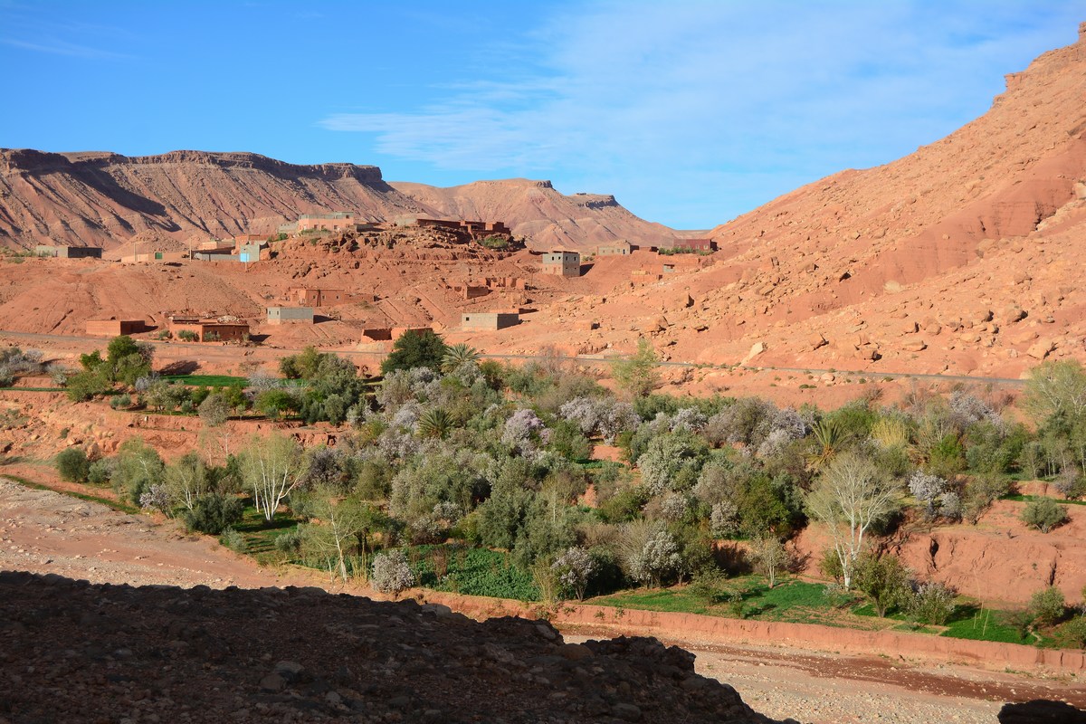 La rivière que l'on remonte au fil des virages, c'est l'Asif Anila. Cela fait relativement peu de temps que cette route est goudronnée, remplaçant la piste des anciens chemins muletiers. 15 000 personnes vivent dans la succession de villages que l'on croise, tous plus beaux les uns que les autres, des modèles d'intégration dans le paysage. Ils sont resserrés au pied de leurs douars.