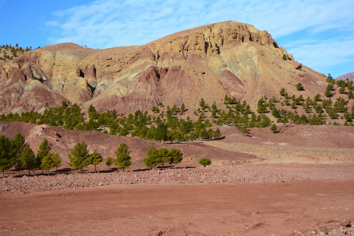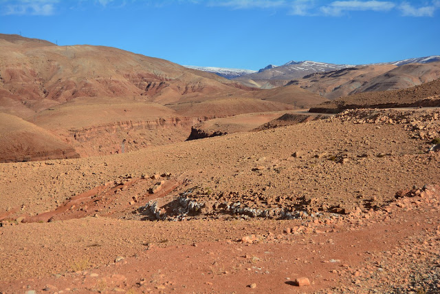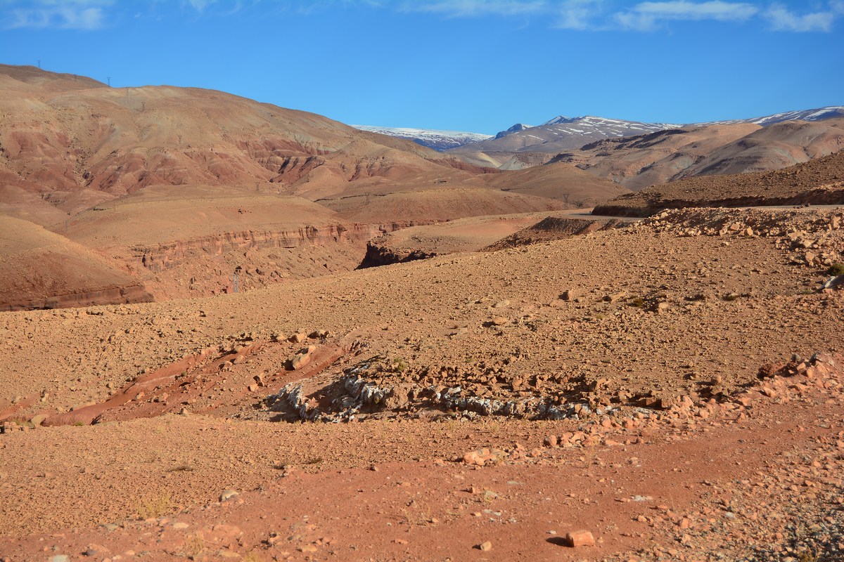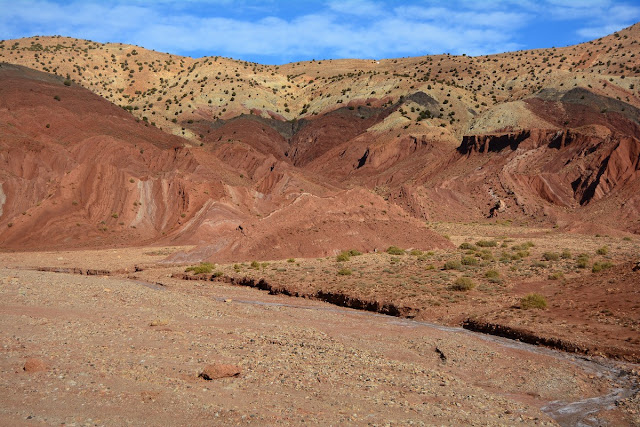 Lorsque vous visitez, comme la plupart des gens, le somptueux ksar d'Aït Ben Haddou et que vous désirez vous rendre sur Marrakech, vous avez deux possibilités : reprendre la nationale principale, la 9, pour filer plein nord sur le col de Tizi N' Tichka, passage obligé, ou bien, et c'est l'objet de cette page, vous pouvez filer plein nord en remontant la vallée de Telouet, par des paysages absolument splendides ! Pour tout dire, c'est la plus belle route que ayons faite dans le grand sud marocain. En revanche il vous faudra du temps, non pas que les kilomètres soient plus nombreux (ce serait même plutôt l'inverse) mais bien parce que vous allez vous arrêter à chaque instant pour prendre en photo ces couleurs insensées de la montagne, ces villages se fondant au décor... Un pur régal...