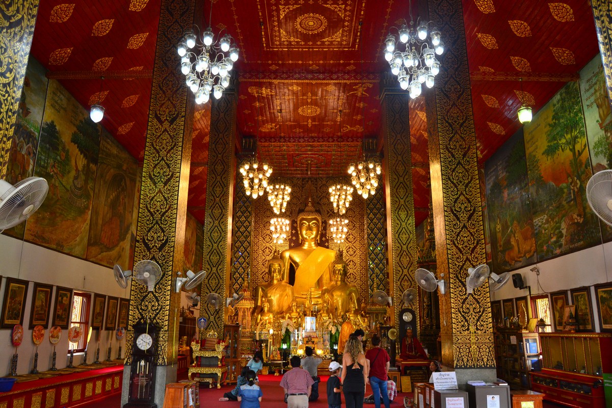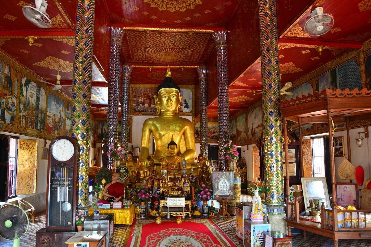 | Hall principal du temple, avec statues de Bouddha. On appelle ce lieu un viharn, pour se réunir mais aussi prier. |