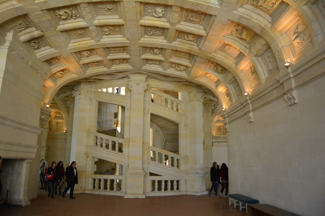 Le double-escalier est sans aucun doute LA partie la plus célèbre de Chambord. C'est un escalier magique, inventé par Léonard de Vinci (on en a retrouvé de nombreux croquis dans ses cahiers) : de l'extérieur, le visiteur semble observer un escalier banal à une vis. Pourtant, il n'en n'est rien ! Deux vis s'enroulent l'une dans l'autre, un peu comme la double hélice de l'ADN, ce qui fait que deux personnes peuvent emprunter le même escalier et arriver au sommet sans même se croiser... sauf à travers une des lucarnes aménagées à l'intérieur du colimaçon (à condition de monter au même rythme). Placé au centre du donjon, le double-escalier dessert à chaque étage quatre vestibules formant une croix.