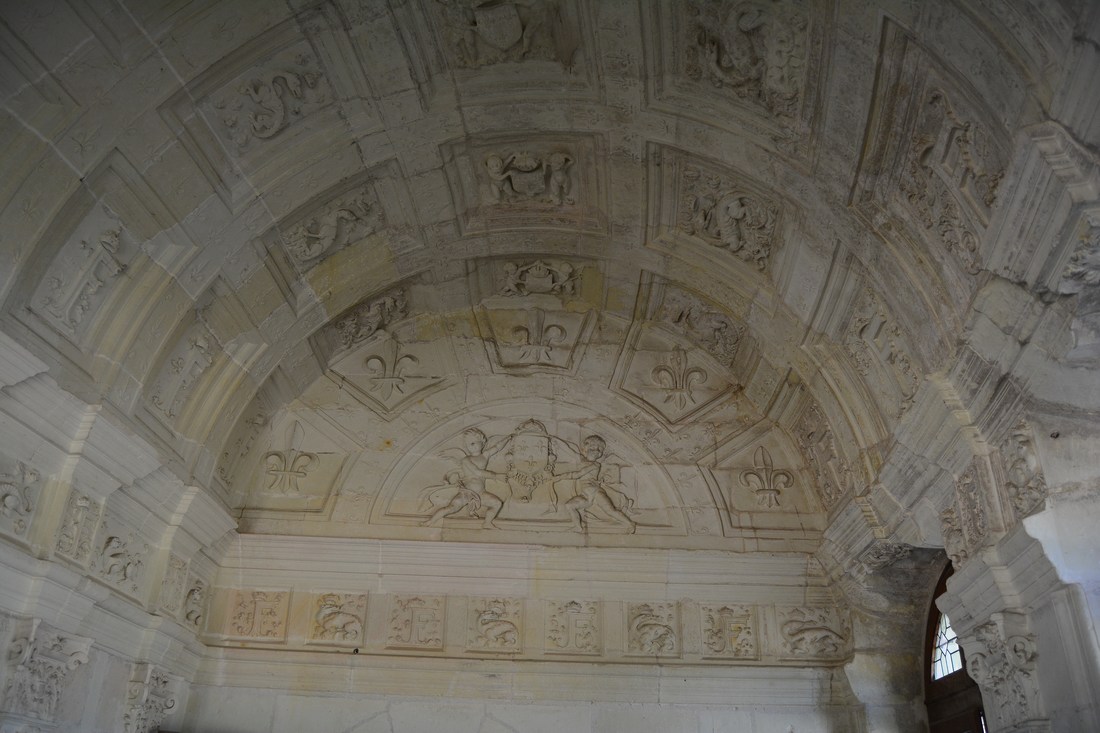 Le fameux double-escalier créé certainement par Léonard de Vinci. Admirez le somptueux plafond à caissons du vestibule au premier plan : on y aperçoit la succession de F (pour François) et de salamandres, l'animal emblématique du monarque. Cet animal, surmonté d'une couronne portant la devise "Nutrisco et Extinguo", 'je me nourris du bon feu, j'éteins le mauvais', était capable, selon la légende (il n'est n'est rien dans la réalité...) de résister au feu. Cette méprise a une explication bien rationnelle : les pauvres salamandres, qui hibernent dans des souches d'arbres, se sont souvent retrouvées dans une cheminée que l'on allumait, prises au piège dans leur cachette. Aux premières chaleurs, elles sortaient en s'enfuyant, et, leur peau étant humide, elles ne flambaient pas tout de suite. Il n'en fallait pas plus pour que son côté mystique ne naisse...