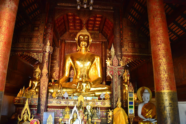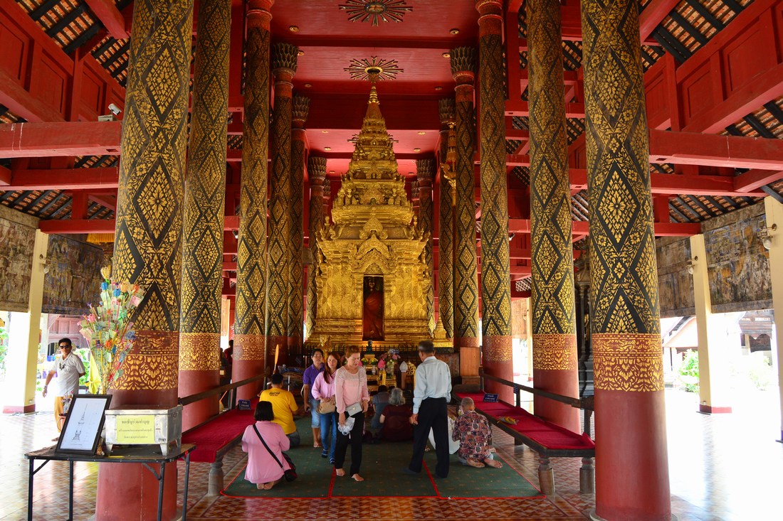Dans l'immense cour, vous découvrirez de nombreux bâtiments de style varié, avec un grand chedi de 45 mètres de hauteur dont la flèche est recouverte de feuilles d'or. Mais, surtout, c'est l'occasion d'admirer le plus vieux temple en bois Lanna de la région, et son magnifique plafond retenu par des piliers en teck.