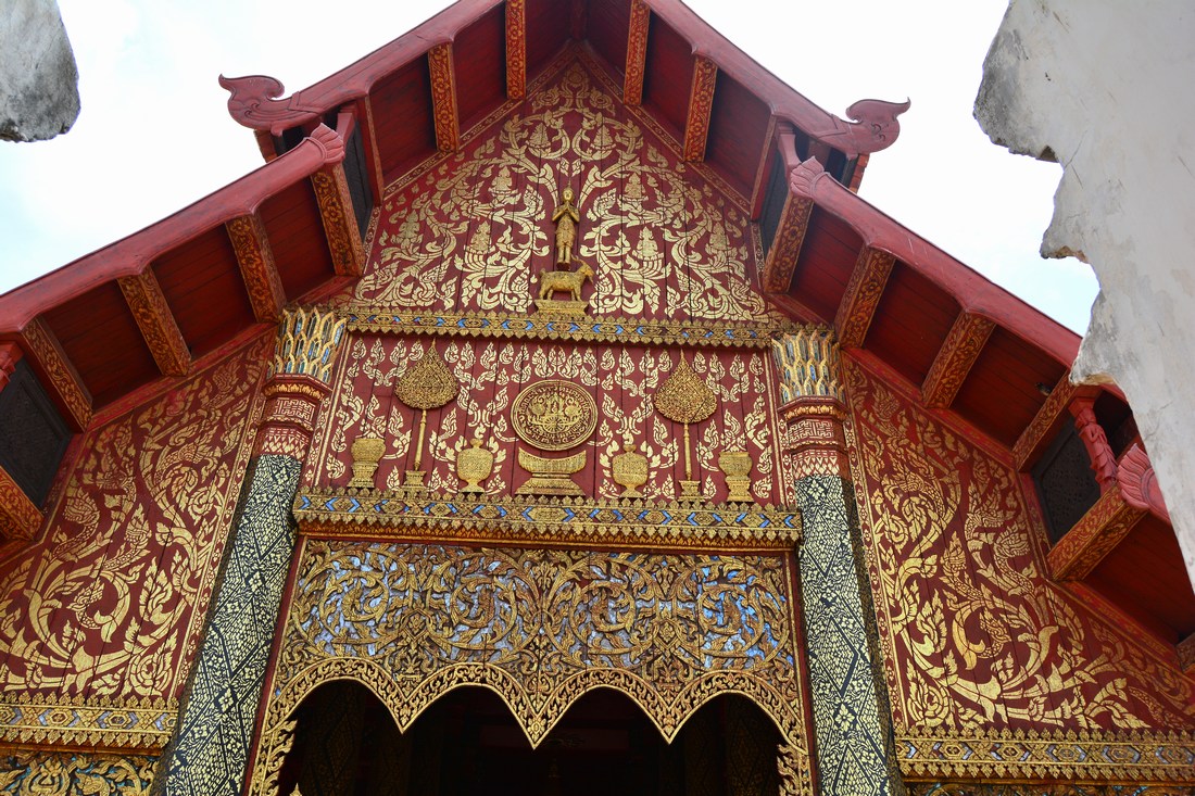 Entrée d'un des halls principaux, richement décoré : le Wihan Luang.