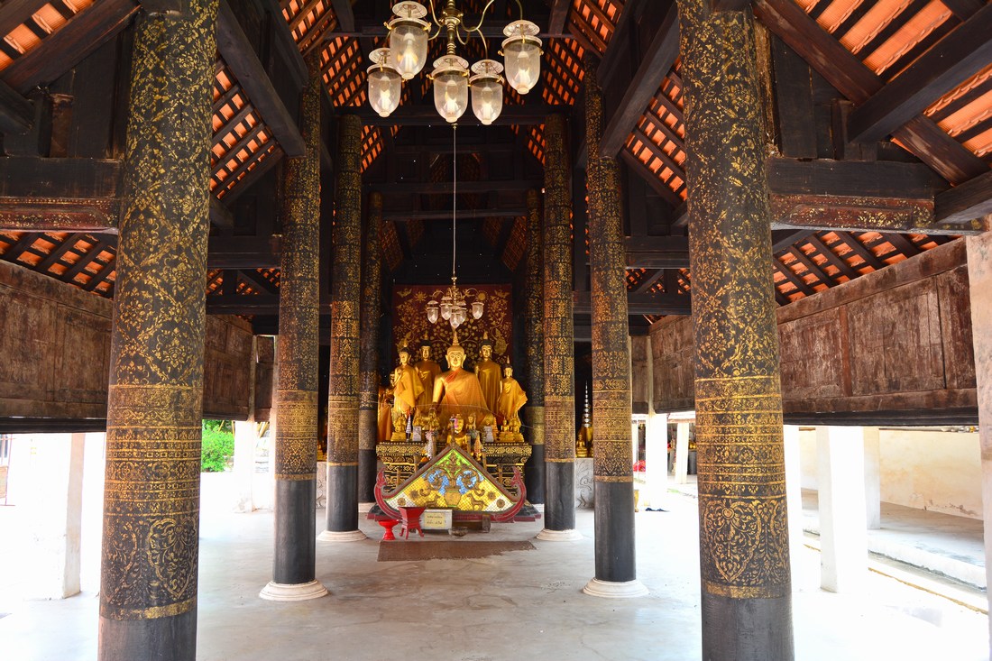 Intérieur du Wihan Luang, remontant au XVème siècle. Son toit en bois à trois niveaux est le plus ancien du pays. D'immenses piliers en teck le soutiennent et tout autour, des peintures murales du XIXème siècle relatent des épisodes des vies antérieures du Bouddha.