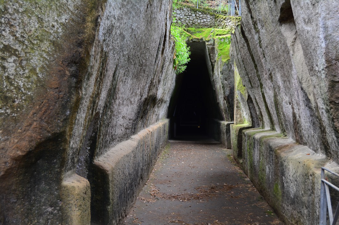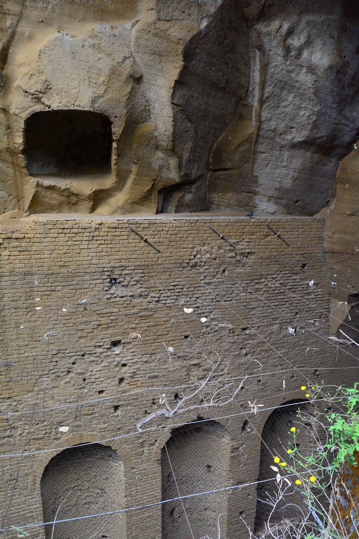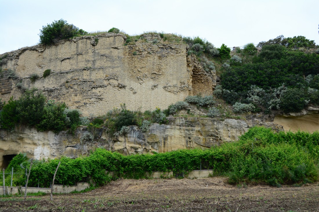 A droite : Il faut traverser la falaise de tuf pour accéder à la partie basse de Cumes. Le tuf est une roche volcanique facile à tailler et percer, que les anciens utilisaient pour la construction.