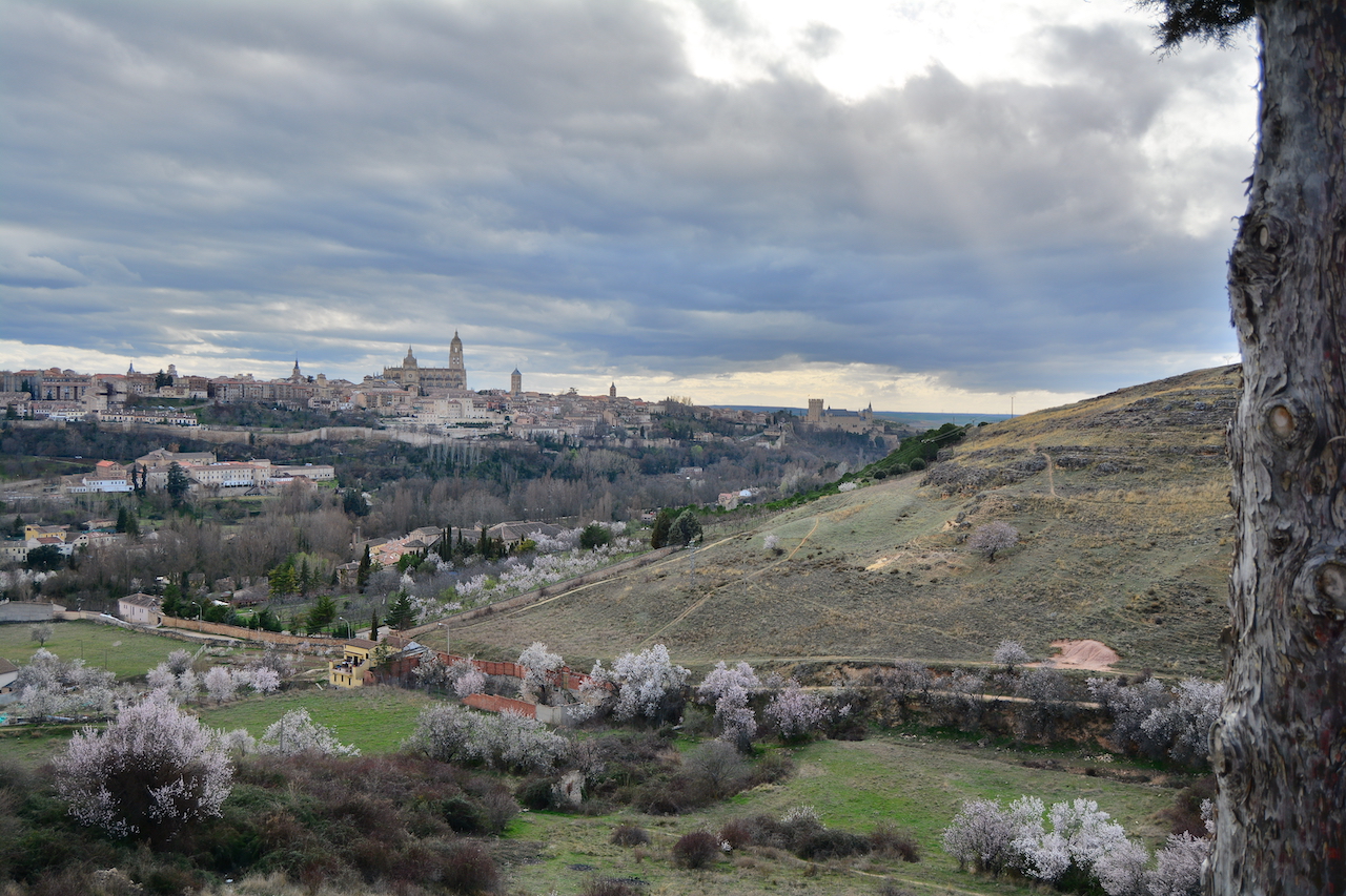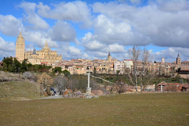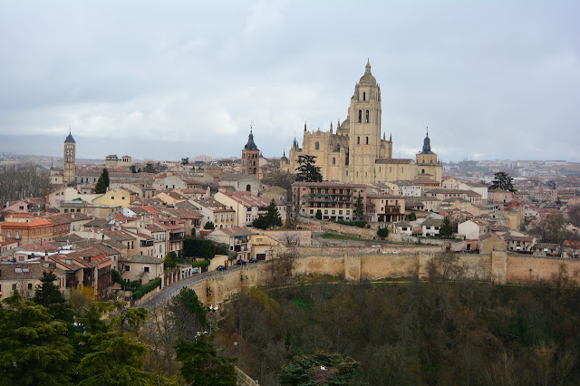 Vue générale de la ville depuis le mirador de Lastrilla, en arrivant à l'Est. On se rend bien compte de la position en hauteur de la cité. L'édifice le plus important est la cathédrale. Sur la droite, au bout du promontoire, le château Alcazar. Enfin, toute la vieille ville est ceinte de murailles.