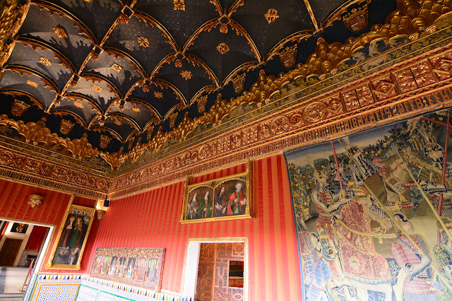 Les intérieurs furent donc richement décorés, et lors de la visite, on passe par des salles successives qui valent surtout pour leurs plafonds ! Levez la tête, vous verrez c'est pas mal...