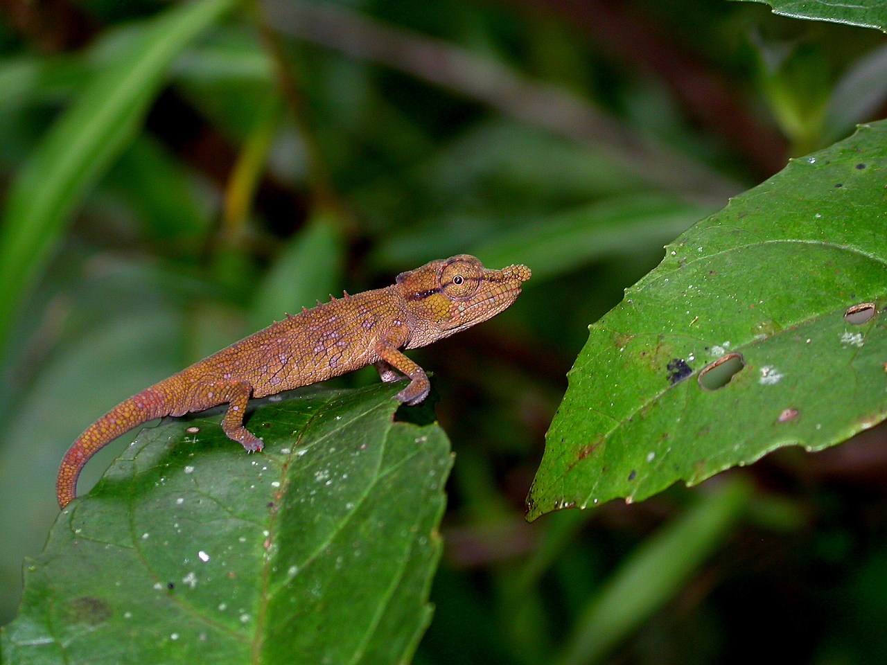 endémique, nord de l'île ; arboricole avec un mimétisme stupéfiant, ressemble à une feuille au niveau de la queue. |