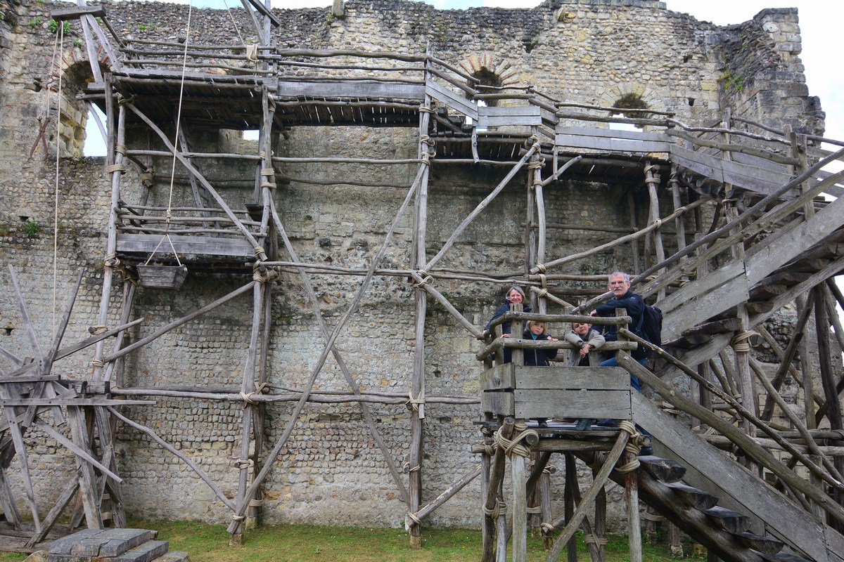 Restes du donjon de Foulques Nerra, XIème siècle, avec une minutieuse reconstitution des échafaudages utilisés alors. Notez les engins de levage.
