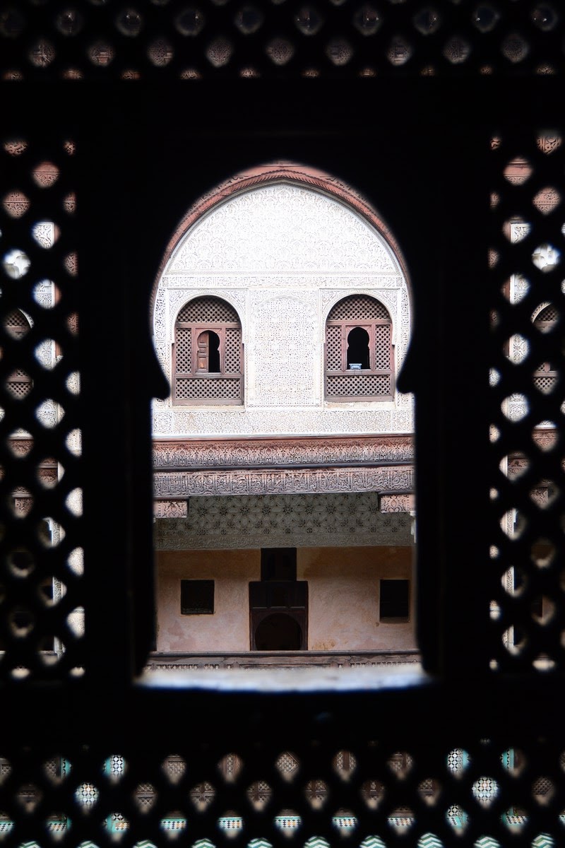 Toutes les fenêtres que l'on aperçoit au premier étage de la cour intérieure sont les cellules des étudiants : il y en avait une soixantaine, chacune avec deux élèves. Ne manquez pas de monter sur la terrasse de la médersa, vous aurez une vue magnifique sur les toits de la ville ainsi que le minaret tout proche de la Grande mosquée.