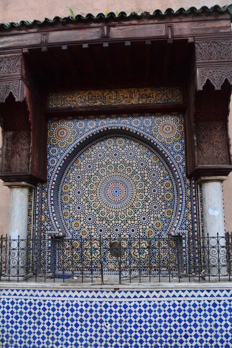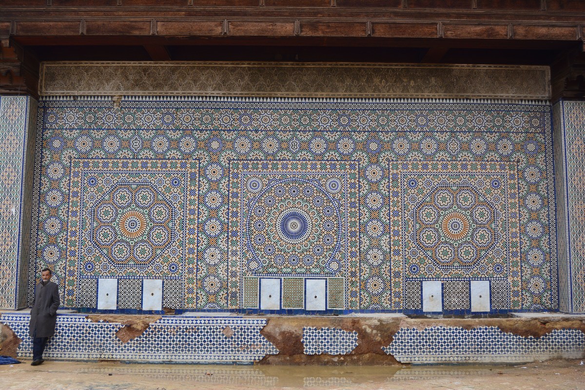 Une magnifique fontaine dans la médina, place el Hedin. La ville de Meknès en possède d'innombrables, mais beaucoup sont dans un tel état de décrépitude que les historiens et les amoureux de la ville ont peur de les voir disparaître dans un avenir proche. Elles font pourtant partie du patrimoine architectural de la ville, avec leurs splendides décorations en mosaïques. Beaucoup ont été supprimées pour contrer un gaspillage et une déperdition de cette denrée vitale. La plus ancienne fut installée à Meknès dès le XIIème siècle !