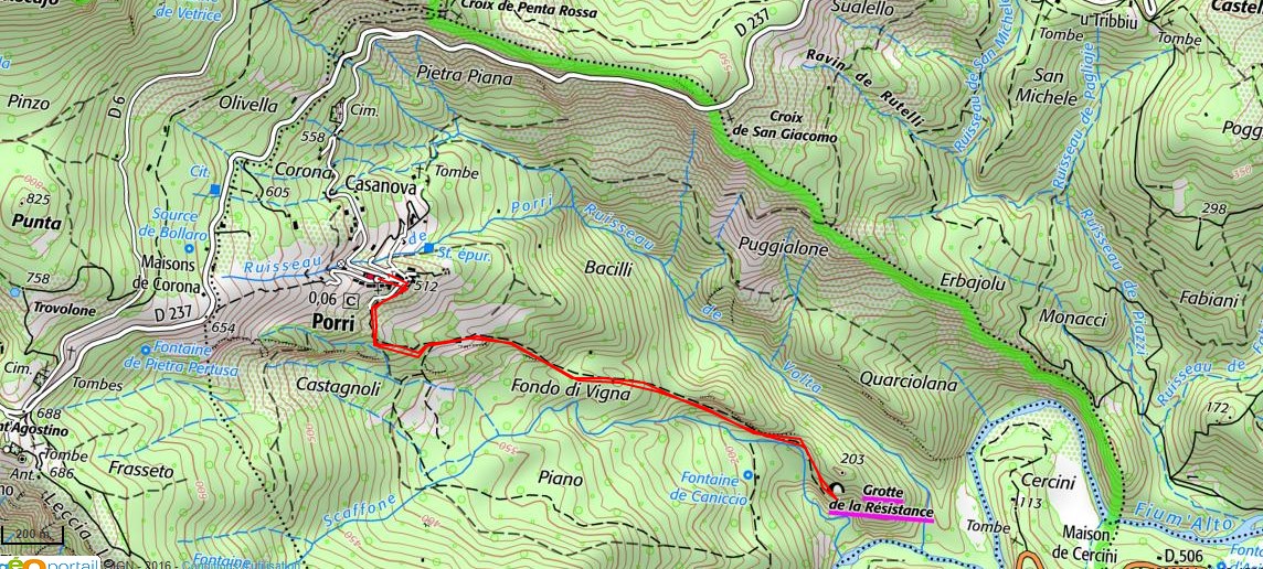 Il s'agit d'une petite randonnée historique depuis le village de Porri, en Casinca, qui fut un haut lieu de la Résistance en Corse durant la seconde guerre mondiale. Nous sommes à 550 mètres, au pied du point culminant de la région, le Monte Sant'Anghjulu et ses 1218 mètres d'altitude. La rando part du centre du village (parking en contrebas de l'église) et plonge dans la vallée du Fium'alto sur près de 400 mètres. La grotte est en fait un petit abri au pied d'une falaise. Durant la Résistance, c'est ici que furent imprimés des tracts et des journaux clandestins pour organiser la lutte contre les Allemands et les Italiens.