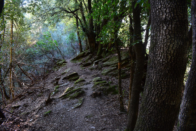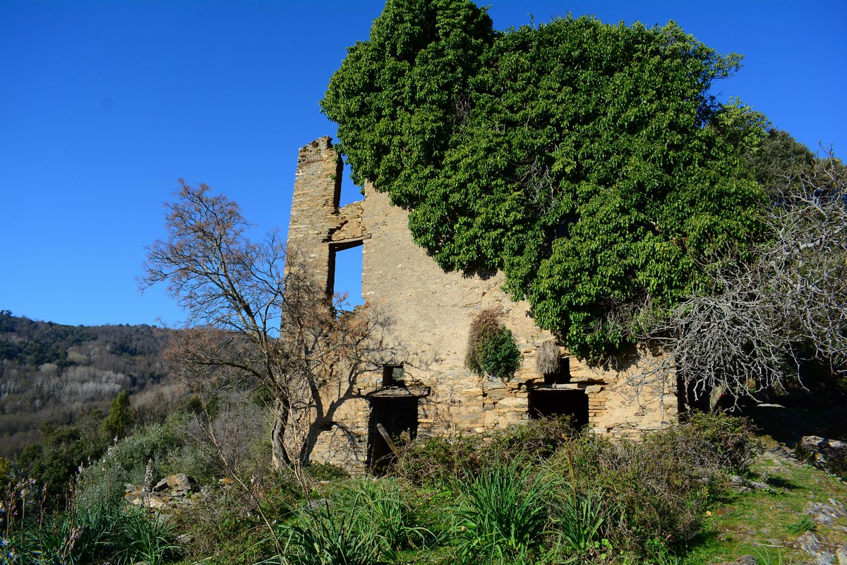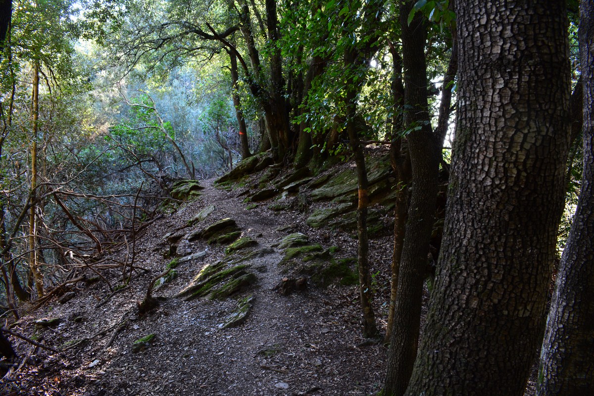 Descriptif de la rando : Du village, le sentier descend fortement. La rando est très bien indiquée, avec des marques orange doublées de panneaux parfois. Impossible de se perdre donc, d'autant que le sentier est souvent entretenu et la végétation coupée. La végétation est assez diversifiée, puisque vous passerez par des zones assez ouvertes à maquis bas au départ, avant de plonger dans un bois sombre de chênes verts, puis une belle châtaigneraie sur un replat. Enfin, à l'approche de la petite falaise qui sera sur votre droite, on longe un cours d'eau qui doit être la plupart du temps bien sec. Seuls les 20 derniers mètres sont en montée pour atteindre l'abri sous roche qui abrita les Résistants.