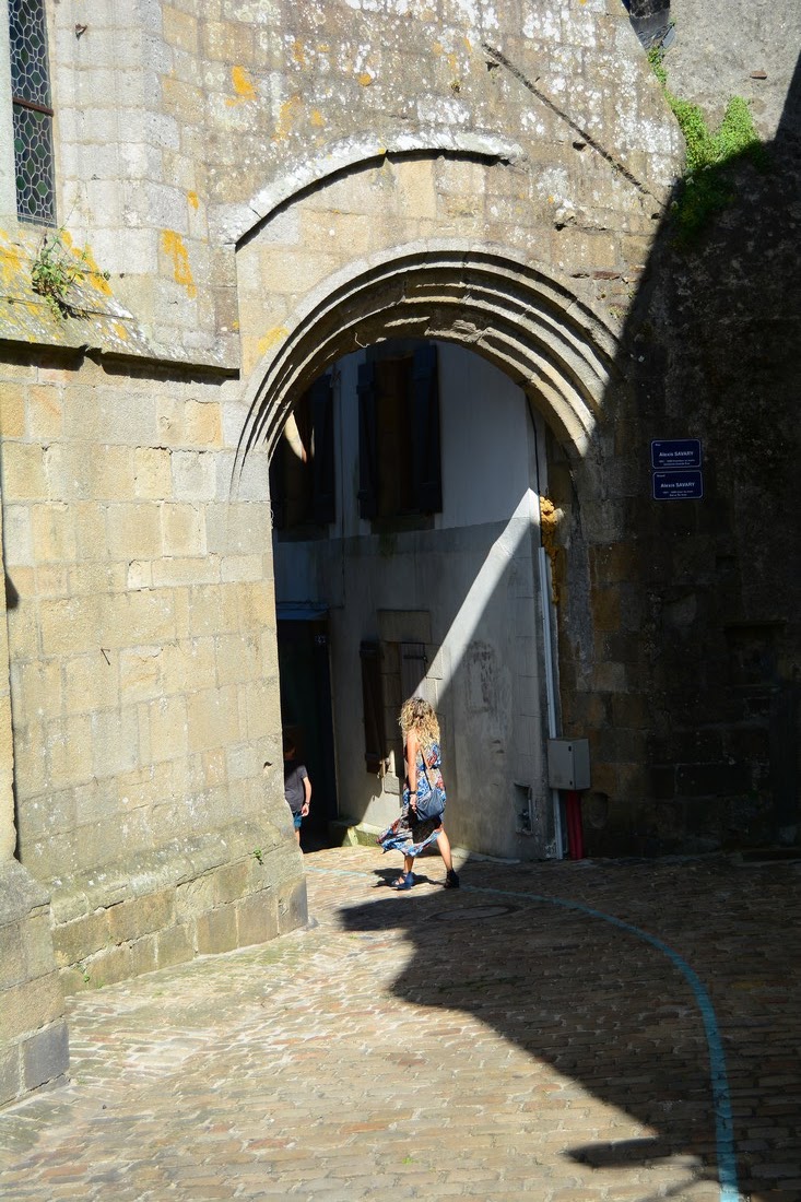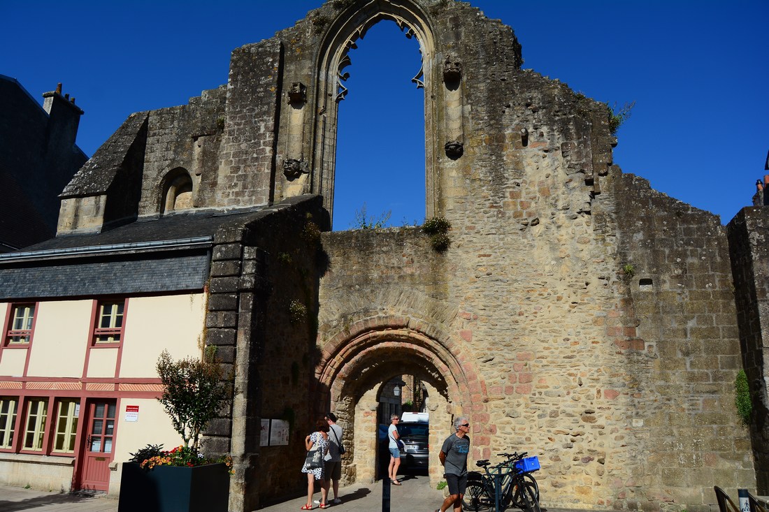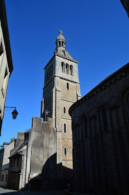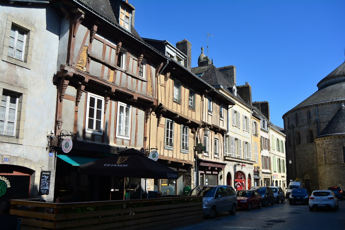 Juste derrière les halles, voici le plus vaste monument de la ville, l'abbatiale Sainte-Croix. Il s'agit d'une des deux seules églises de Bretagne à posséder un plan circulaire, calqué sur celui de l'église du Saint-Sépulcre à Jérusalem. En plus du cercle, l'église est en forme de croix grecque. Si certains éléments du XIème siècle demeurent encore, dans le plus pur style roman, comme la crypte ou le chevet, l'abbatiale a malheureusement subi de gros dégâts en 1862 lorsque le clocher s'est effondré. La choeur, aujourd'hui surélevé, date de la restauration.
