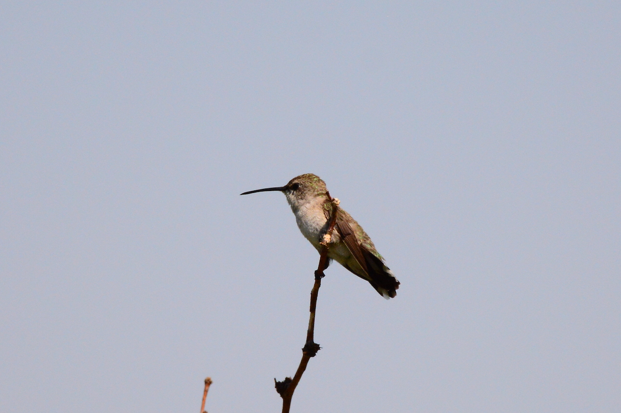 | Archilochus alexandri - Colibri à gorge noire - USA Texas Parc National de Big Bend petite taille (8 cm) ; vert métallique sur le dessus et sur les flancs ; tête noire, bande violette à la gorge ; queue fourchue ; possède une longue langue extensible qui lui permet d'accéder au nectar de certaines plantes. |