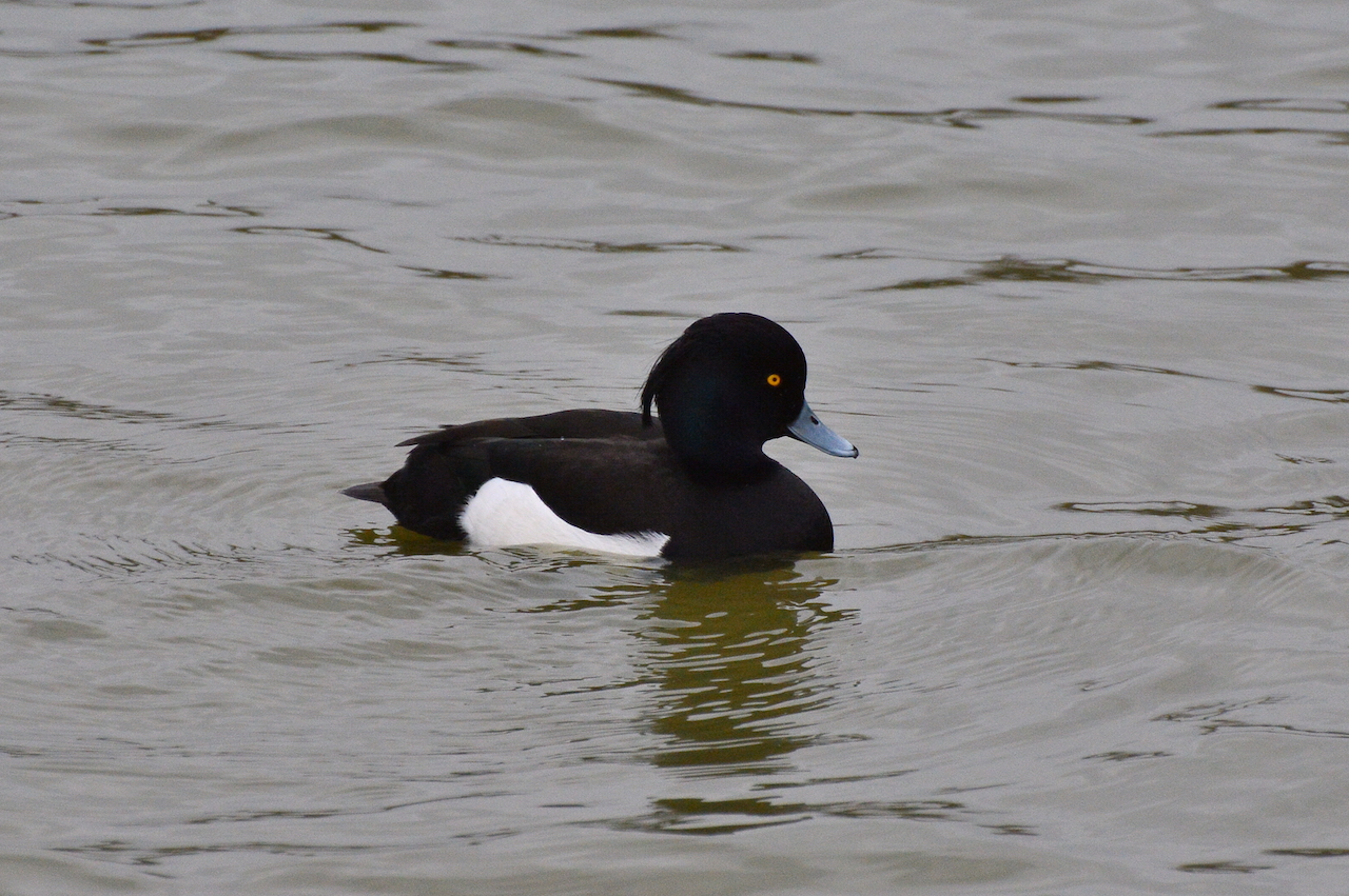 | Aythya fuligula - Fuligule morillon - Angleterre Londres mâle adulte immanquable, tout noir à l'exception des flancs blancs ; yeux jaune or ; fine crête à l'arrière de la tête ; se nourrit sur les étendues de marais et de lacs en plongeant à la recherche de mollusques, insectes aquatiques et même certaines plantes. |