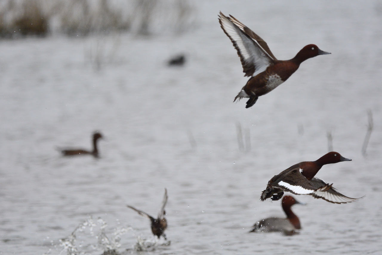 | Aythya nyroca - Fuligule nyroca - Maroc Oualidia mâle d'une jolie couleur châtain foncé sur la tête, la poitrine et les flancs, avec des ailes sous-caudales d'un blanc éclatant, offrant un beau contraste en vol ; oeil jaune chez le mâle ; affectionne les nappes d'eau peu profondes avec une riche végétation submergée et flottante. |