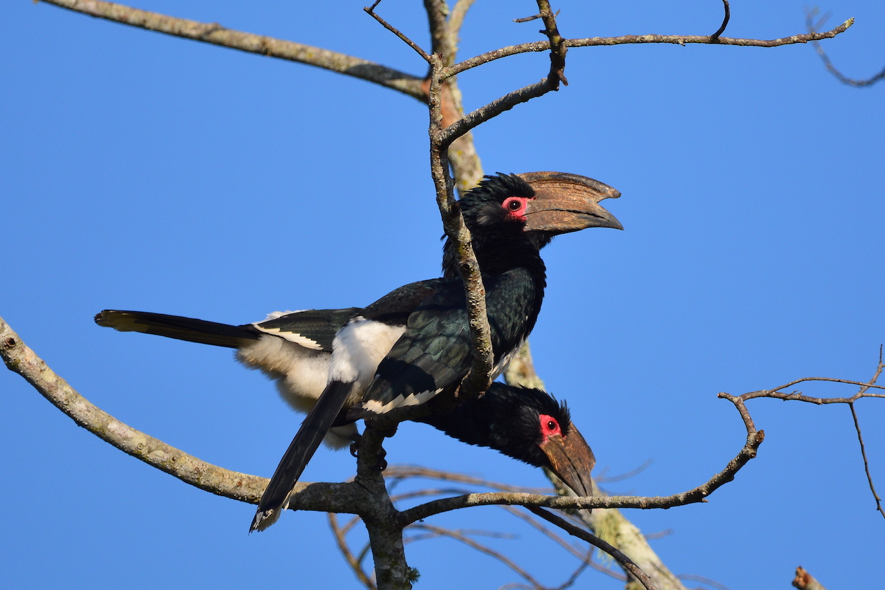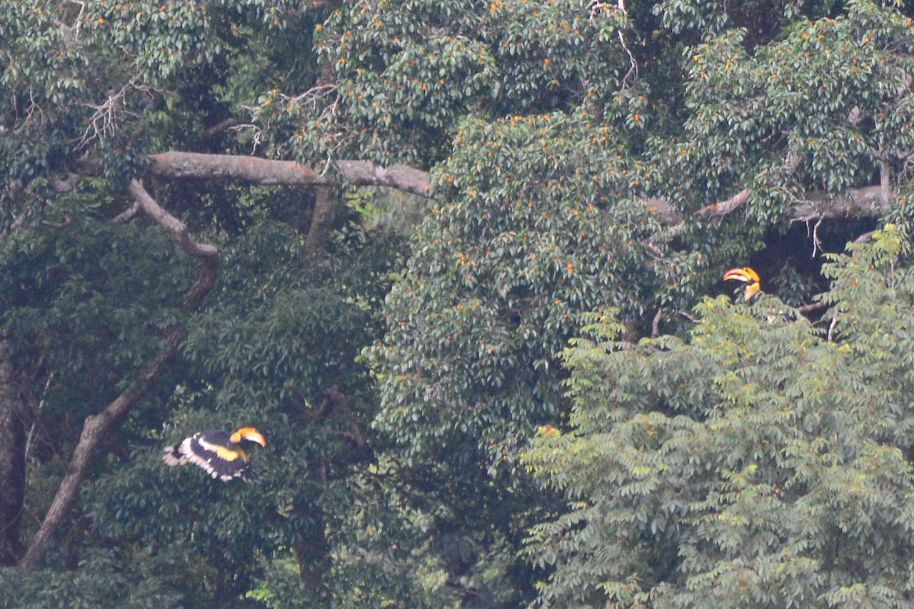 | Buceros bicornis - Calao bicorne - Thailande Parc National de Khao Yai parmi les plus grands des calaos (1,3 mètre) ; beau casque jaune vif sur le dessus de son bec massif qui se termine en double pointe, d'où son nom d'espèce (il semble être le résultat d'une sélection sexuelle, les mâles étant connus pour se livrer entre eux à de féroces combats aériens, en se donnant des coups de casque) ; bruit lourd et caractéristique en vol. |