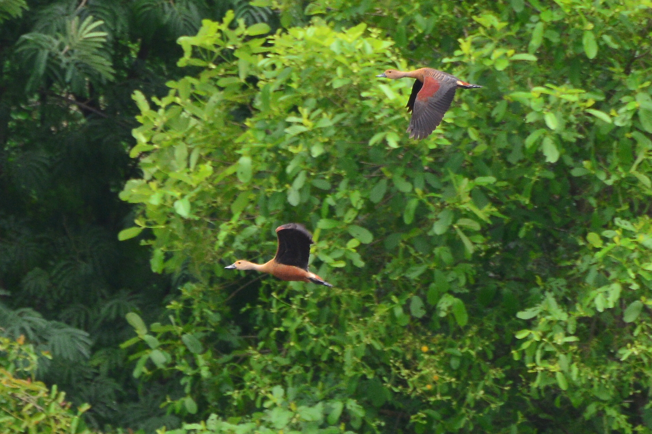 | Dendrocygna javanica - Dendrocygne siffleur - Thailande Si Satchanalai couleur brune, avec un anneau orange à jaune autour de l'oeil ; tête maintenue en-dessous du niveau du corps en vol, comme on le voit bien sur la photo ; les larges ailes sombres sont également distinctives. |
