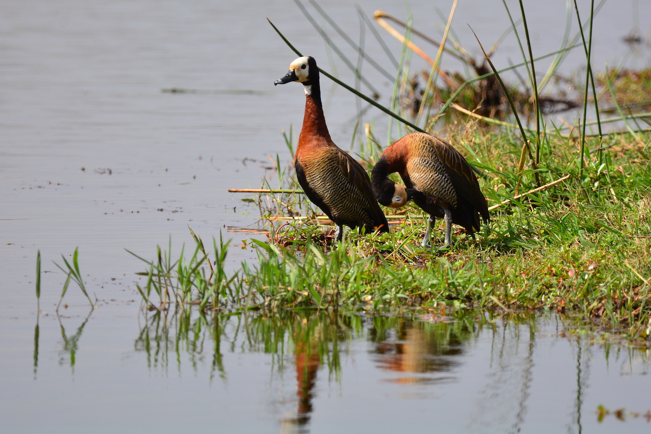 | Dendrocygna viduata - Dendrocygne veuf - Afrique du Sud Parc National de Kruger canard siffleur à face blanche caractéristique, avec une longue tête et de longues pattes ; cou noir ; dos et ailes brun foncé à noir, et fines rayures blanches sur les flancs ; curieusement (transport par l'Homme ?) sa répartition est disjointe, à la fois en Afrique subsaharienne et en Amérique latine. |