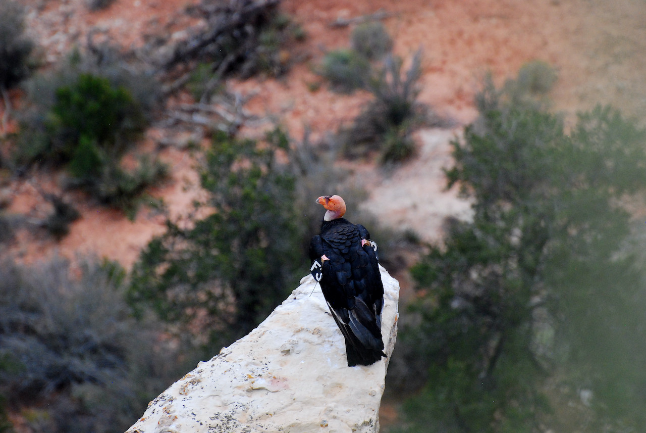 | Gymnogyps californianus - Condor de Californie - USA Grand Canyon immense rapace (peut atteindre 3 mètres d'envergure) ; noir uniforme à l'exception de grandes taches triangulaires blanches sur la face inférieure des ailes ; bec couleur ivoire, collerette de plumes noires entourant la base du cou ; ce cou a peu de plumes, tout comme la tête, et est capable de rougir en réponse à un état émotionnel, ce qui peut servir dans la communication entre les individus ; vocalise très peu, comme tous les vautours du nouveau monde, n'ayant pas de syrinx. |