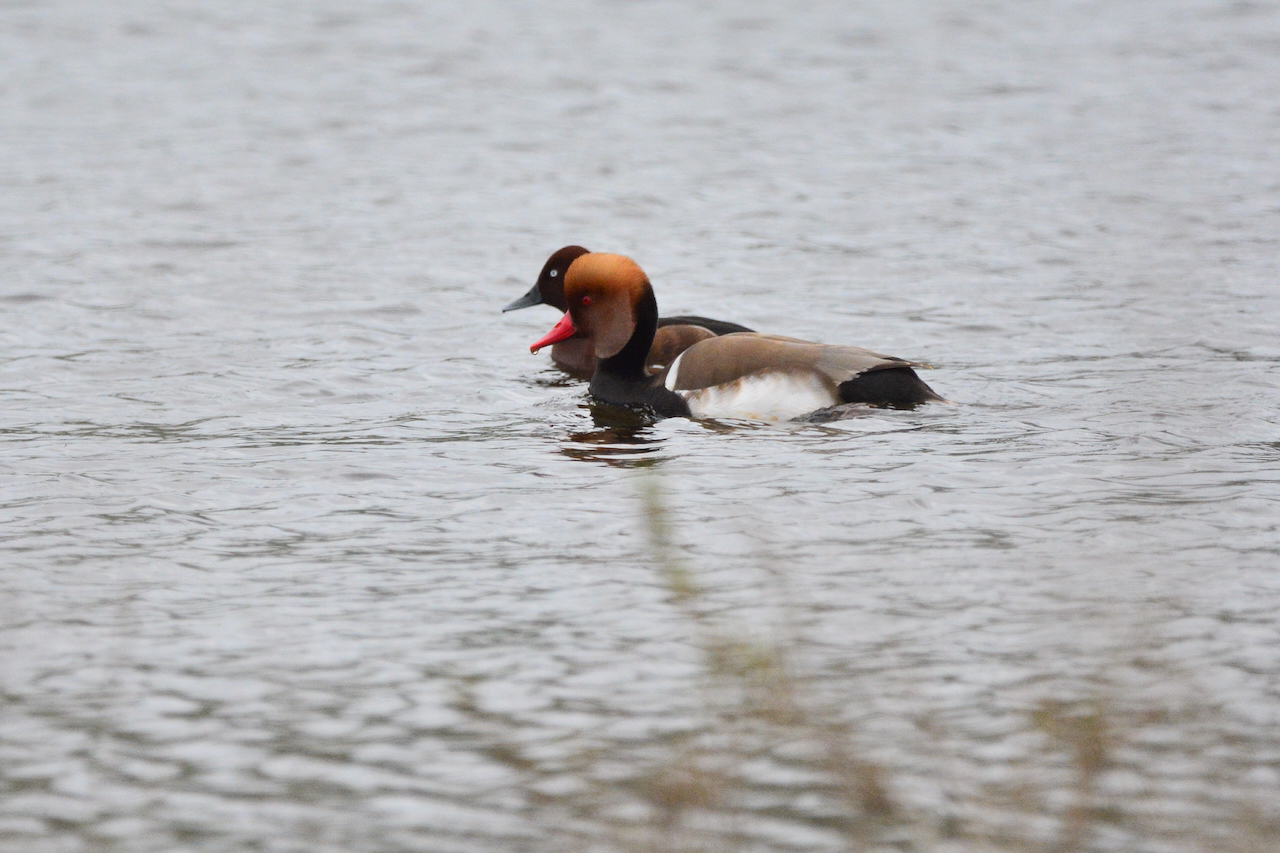 | Netta rufina - Nette rousse - Maroc Oualidia un des canards les plus spectaculaires, tout du moins pour le mâle, avec sa tête orange arrondie, son bec rouge et une poitrine noire ; flancs bruns et queue noire ; se nourrit en barbotant parmi les canards d'autres espèces auxquelles il aime se mélanger ; apprécie particulièrement les plantes aquatiques. |