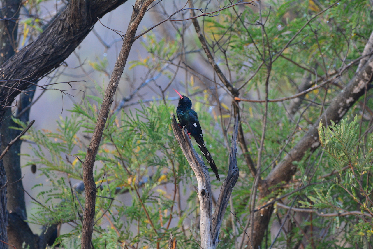 | Phoeniculus purpureus - Irrisor moqueur - Afrique du Sud Parc National de Kruger beau plumage vert métallisé avec un dos tirant sur le violet ; marques blanches distinctives sur les ailes et les bords de la queue ; long bec rouge mince et incurvé ; espèce insectivore qui se nourrit principalement au sol ou sur les termitières ; il possède des griffes spécialisées lui permettant de s'accrocher facilement aux branches. |