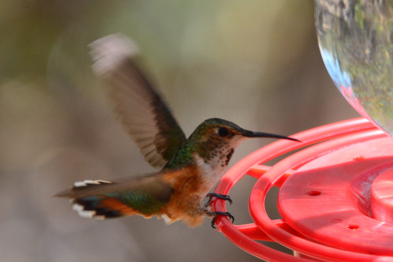 | Selasphorus rufus - Colibri roux - USA Nouveau Mexique Apache del Bosque mâle adulte avec une poitrine blanche, une face rousse avec des flancs et une queue orange ; taille 8 cm pour un poids de 4 à 5 grammes seulement ; se nourrit en journée et entre en état de torpeur la nuit ; est capable d'une migration de 3000 kilomètres jusqu'au Mexique ! |