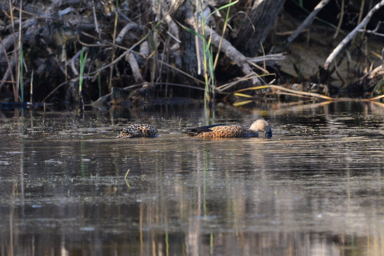 | Spatula smithii - Canard de Smith - Afrique du Sud Hermanus gros bec spatulé avec un plumage gris-brun moucheté et des pattes orange ; aime les zones humides ouvertes avec une végétation émergente ; balance son bec de chaque côté afin de filtrer l'eau. |